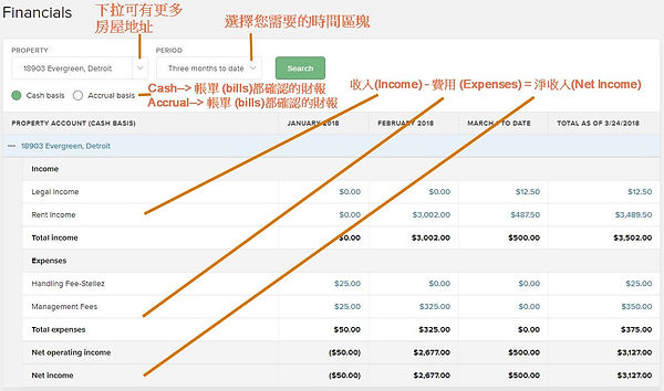 Q: 何謂 Rentals / Properties / Financials 的 收費 (charge)與收到的金額 (payment) ?